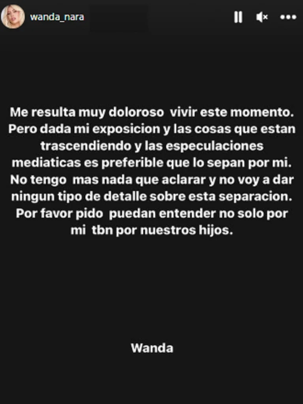 Hace dos semanas Wanda anunció su separación. “Me resulta muy doloroso vivir este momento pero dada mi exposición y las cosas que están trascendiendo y las especulaciones mediáticas es preferible que lo sepan por mí. No tengo más nada que aclarar y no voy a dar ningún tipo de detalle sobre esta separación. Por favor pido puedan entender no solo por mí, también por nuestros hijos”, escribió la empresaria en una historia el pasado 22 de septiembre, acompañado la publicación con su firma: “Wanda”.