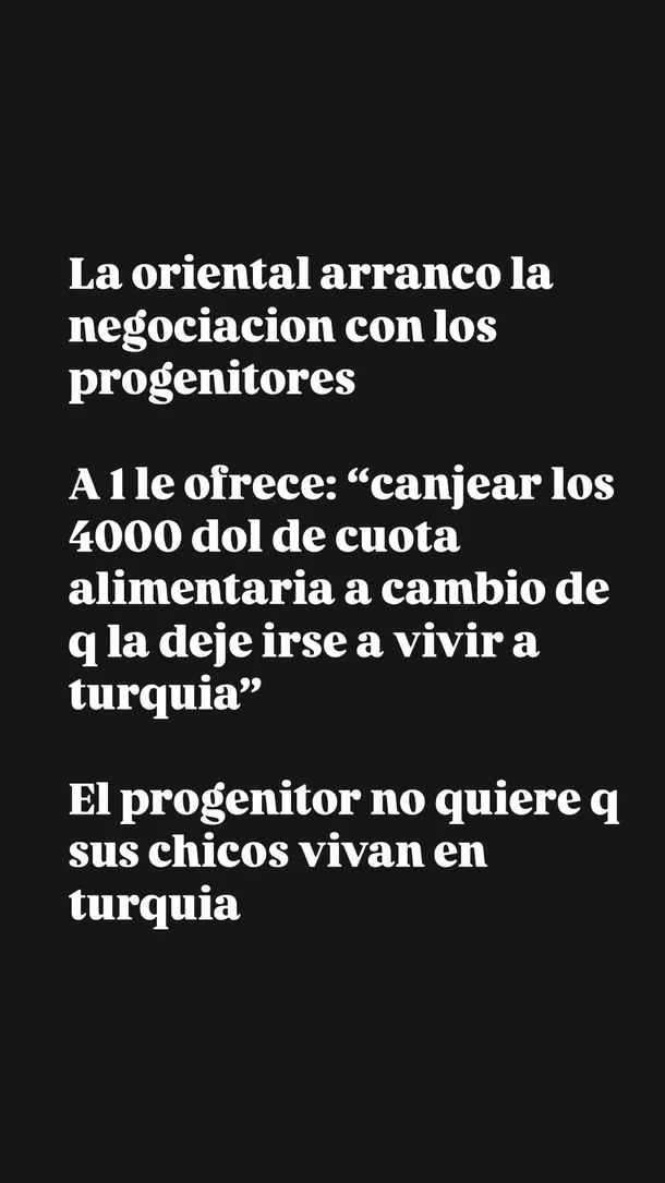 A través de sus historias de Instagram, la panelista de LAM (América TV) comenzó contando: “La oriental arrancó la negociación con los progenitores. A uno el ofrece: ‘canjear los 4000 dólares de cuota alimentaria a cambio de que la deje irse a vivir a Turquía’. El progenitor no quiere que sus chicos vivan en Turquía".Luego, detalló qué le habría dicho a uno de los progenitores: "'Si me dejás llevar a los nenes, mi novio se va a hacer cargo, no me pasás más los 4000 dólares y te ahorras los colegios'”.