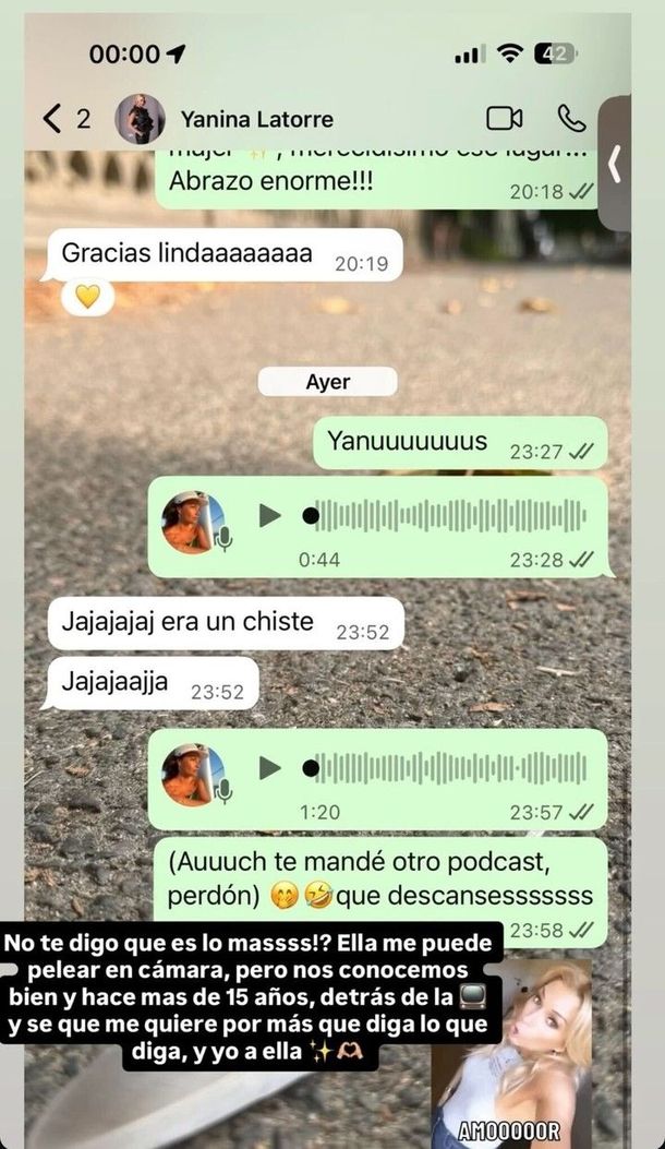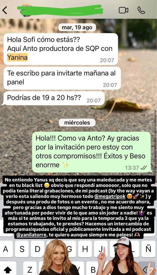 La respuesta de Sofía no tardó en llegar, y llegó con pruebas. A través de sus redes sociales, la modelo compartió capturas de los chats privados que demostraban que sí había respondido en tiempo y forma a la invitación de la conductora. "No entiendo, Yanus, por qué decís que soy una maleducada y me metes en tu lista negra, respondí con amor, sólo que no podía ir porque tenía mil grabaciones", escribió la actriz, aclarando que su negativa no tenía que ver con falta de respeto sino con su agenda ocupada.