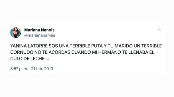 La frase de Mariana, textual y sin filtro, aún resuena en las redes: “Yanina Latorre sos una terrible puta y tu marido un terrible cornudo. ¿No te acordás cuando mi hermano te llenaba el culo de leche?”, escribió la mediática el 21 de febrero de 2013 desde su cuenta de X, por entonces Twitter. El mensaje generó un revuelo inmediato, con miles de respuestas, menciones y debates en programas de espectáculos. Durante años, Yanina eligió no dar detalles. Hasta ahora.