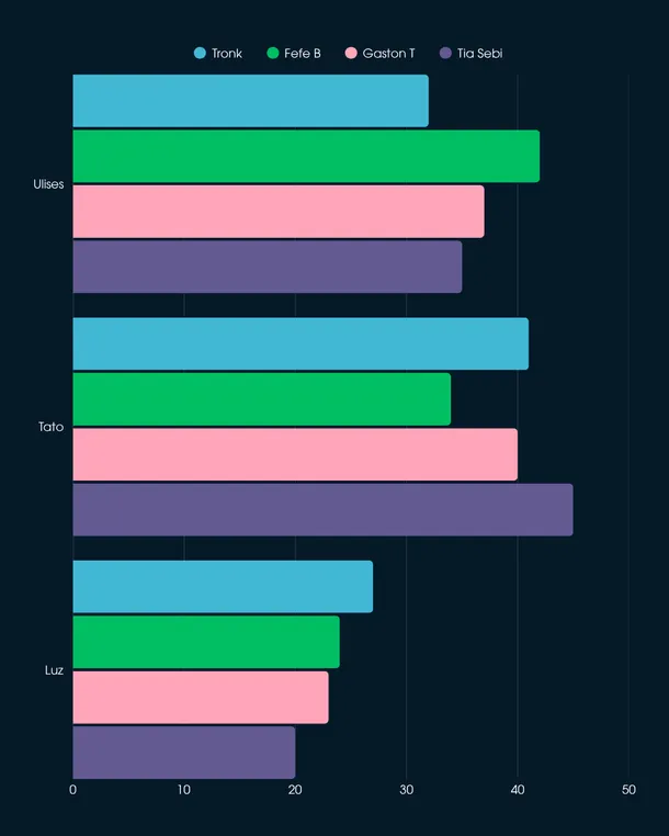 Tras la eliminación de Eugenia Ruiz este lunes (cuarto puesto), la jujeña, el uruguayo y el cordobés quedaron como finalistas de esta edición, con dos fandoms bien marcados: el del "Tridente" (Tato y Luz) y el de los "Apóstoles" (Ulises).