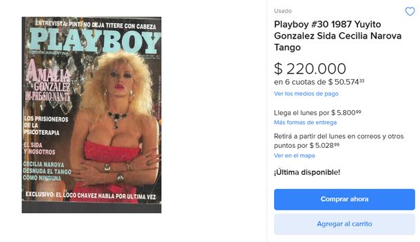 Después de varias apariciones públicas, Yuyito González confirmó su romance con el presidente Javier Milei. Esta noticia provocó un auge por la imagen de quien supo ser una de las vedettes más populares y deseadas del país. Y no faltan quienes buscan sacar provecho económico de esto. En Mercado Libre, un usuario pide por un ejemplar de la revista Playboy de 1987 220 mil pesos. En la publicación en cuestión, la tapa es ocupada por Yuyito, bajo el título “Amalia González im-pre-sio-nan-te", bajo la promesa de que en el interior hay imágenes de ella desnuda.