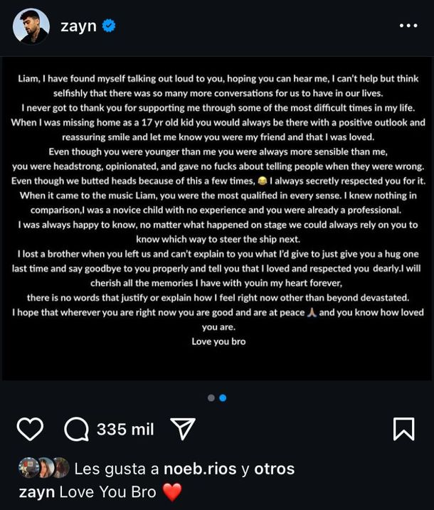 Además del mensaje inicial, Zayn lanzó un descargo en el que se notaba profundamente triste al enterarse de la noticia: "Liam, me he encontrado hablando en voz alta contigo, esperando que puedas escucharme. No puedo evitar pensar, de manera egoísta, que hay muchas más conversaciones que podríamos haber tenido en nuestras vidas. Nunca tuve la oportunidad de agradecerte por estar a mi lado en algunos de los momentos más difíciles que he enfrentado".