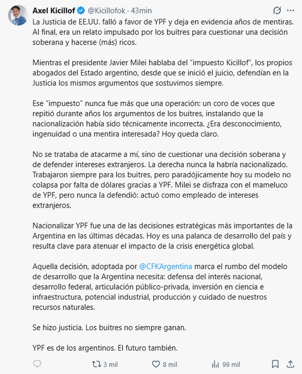 Tras conocerse la victoria judicial, el gobernador de la provincia de Buenos Aires, Axel Kicillof, publicó un extenso descargo en sus redes sociales. "La Justicia de EE.UU. falló a favor de YPF y deja en evidencia años de mentiras. Al final, era un relato impulsado por los buitres para cuestionar una decisión soberana", sentenció el exministro de Economía.
