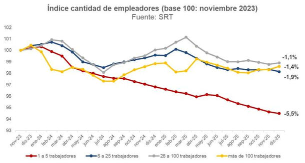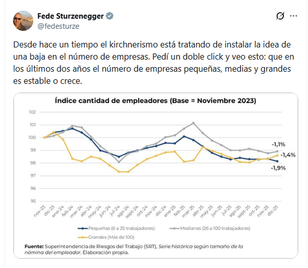 A pesar de esta alarmante realidad, el funcionario libertario aseveró recientemente en su cuenta de la red social X que la reducción de empleadores es "un relato" impulsado por la oposición y que "el número de firmas pequeñas, medias y grandes es estable o crece". Curiosamente, su propio gráfico expone las caídas oficiales: las firmas "pequeñas" (de 6 a 25 trabajadores) bajaron 1,9%, las "medianas" un 1,1% y las "grandes" cayeron 1,4%.