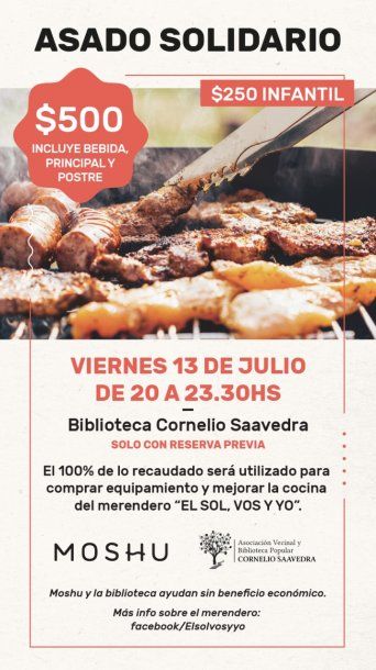 Moshu y la Biblioteca Cornelio Saavedra ofrecerán un asado solidario a beneficio del merendero "EL sol, vos y yo"