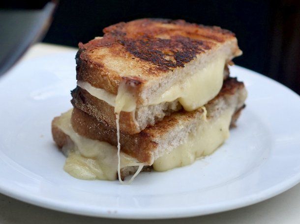 - Sándwich Grilled Cheese que se compone de rebanadas bien tostadas de pan de molde rellenas de queso gorgonzola italiano, cuartirolo y muzzarella de primera línea, servido con pickles de pepino que aportan un punto de acidez y frescura.