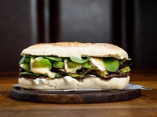 - Sándwich Veggie que lleva zucchinis y berenjenas grilladas, hongos salteados, queso brie, palta, rúcula y queso crema en pan ciabatta integral. Todos ellos se acompañan con una porción de papas triple cocción.