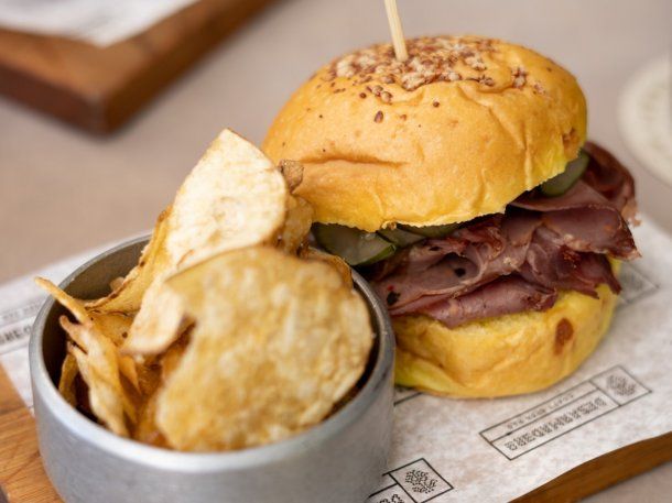 - Brisket, de tapa de asado braseada con salsa París a base de mostaza dulce, pickles de pepino y cebolla morada.