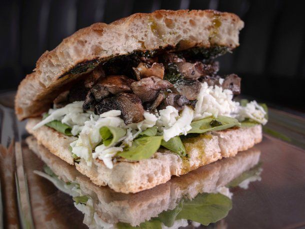 - Sándwich de de hongos portobello en focaccia de masa madre con queso de cajú, rúcula y pesto.