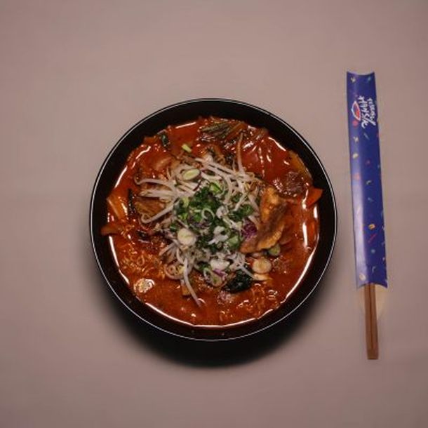 Haemul Ramyeon: Fideos ramyeon coreano con sopa picante con mariscos. Super picante.
