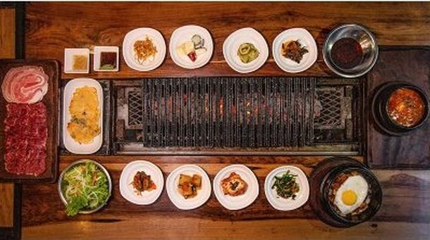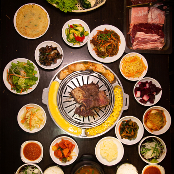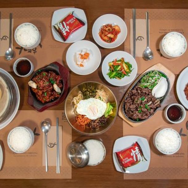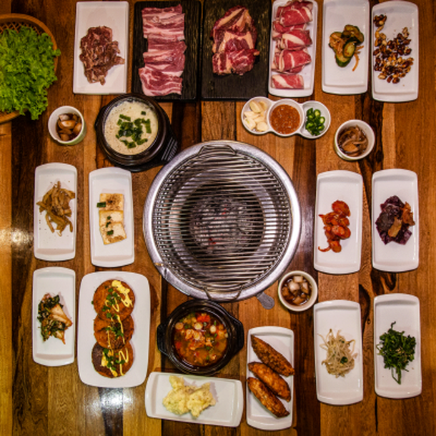 Parrilla coreana: Ojo de bife, Panceta, Bulgogi (carne de res marinada), Variedades de Banchan con Kimchi (guarniciones), Variedades de Jeon y fritos, Chinchulines condimentos, Sopas de diferente clases, arroz
