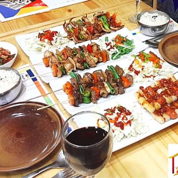 Parrilla Coreana: Carne de cerdo, vaca, chinchulín, panceta y langostinos (todos a la plancha); Variedad de guarniciones; Bowl de arroz Mulmandu (Ravioles hervidos); Sopa de Doenjang (Poroto fermentado); Tortilla; Bebida de Arroz (Sikhye)