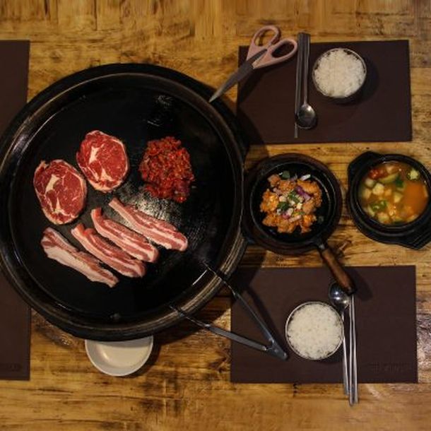 Set Samgyeobsal y Chadolbagi: Media porción de panceta y media porción de lomo en lámina a la plancha acompañado con sopa del día.