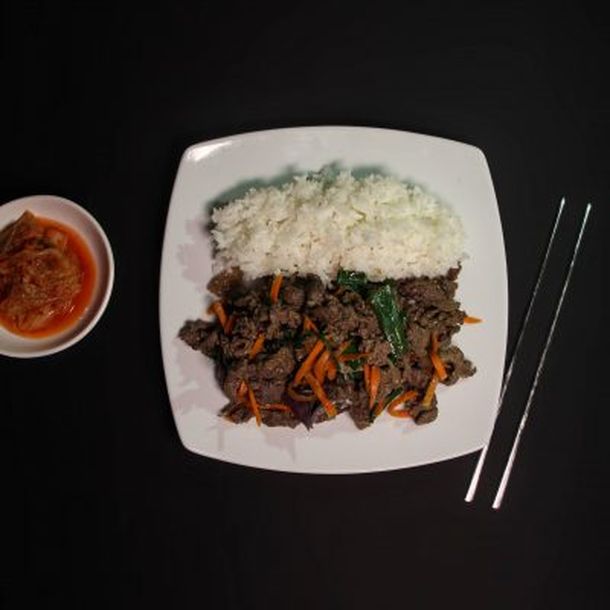 Bulgogi (carne de res marinado en salsa soja agridulce) + Arroz