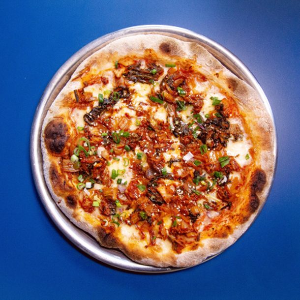 Pizza de kimchi y panceta (Opción vegetariano con hongos). Precio: $ 1500