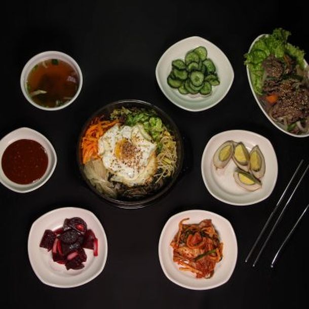 Dolsot bibimbap & bulgogi: arroz con verdura, carne y huevo frito en un bowl caliente, con carne de res condimentado con salsa agridulce. Los platos vienen acompañados con 4 banchan (acompañamientos) del día.