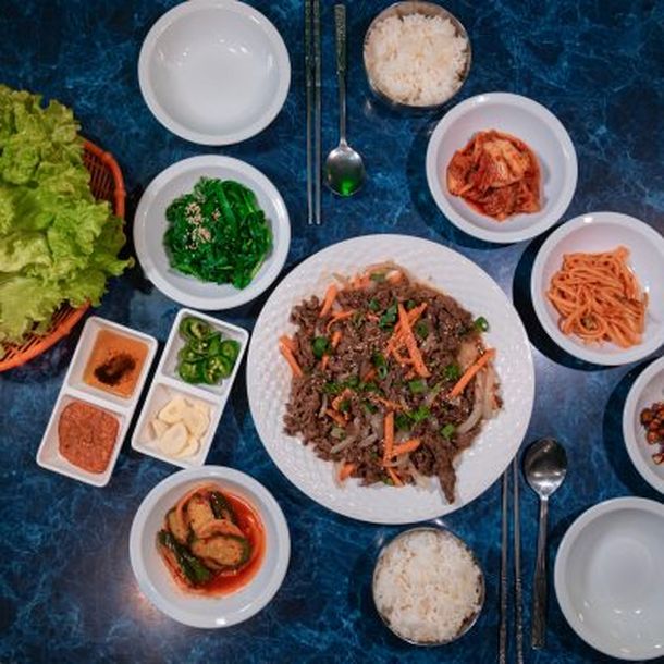 Yukgaejang & bulgogi : sopa picante de carne de res con verdeo y huevo batido; y carne de res condimentado con salsa agridulce.Los platos vienen acompañados con 4 banchan (acompañamientos) del día.