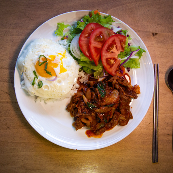 Jeyuk deopbab: cerdo y verduras salteados con salsa picante + arroz con huevo. Precio: $1200