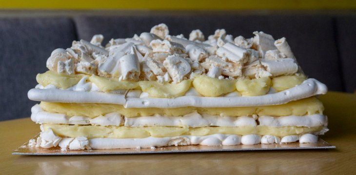 El armado. Sobre una base de merengue rectangular, distribuir un tercio de la crema de manteca. Cubrir con otra placa de merengue seco y volver a untar con la crema. Colocar la última capa de merengue seco y terminar con la crema de manteca.