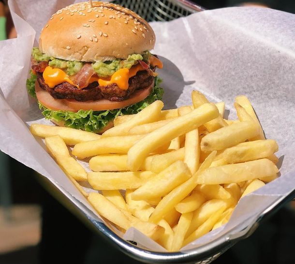 A eso se le suman lonjas de símil panceta hechas con arroz, extracto de remolacha, féculas, especias y humo líquido, cheddar vegano, rodajas de tomate, hojas de lechuga y un cremoso aderezo de la casa a base de ketchup, mayonesa vegan, mostaza con pepino encurtido y especias.