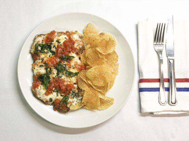 La milanesa Parmigiana se prepara con bife de chorizo de pastura, harina orgánica, huevos de campo y pan rallado casero. Una vez lista la milanesa, primero se sella en manteca clarificada y luego se termina al horno con pomodoro italiano y queso cuartirolo tandilense por encima. Se sirve aromatizada con orégano fresco deshidratado y acompañada de papas rejilla.