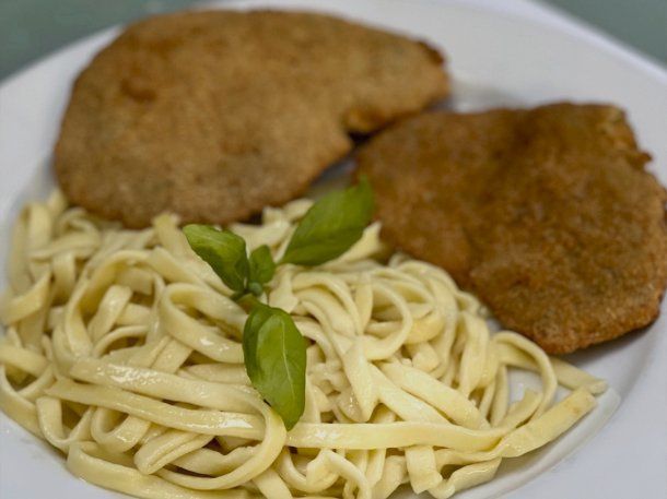 La milanesa de carne con tagliatelle caseros es de peceto, rebozada en pan rallado, sellada a la sartén con aceite de oliva y acompañada de una pasta larga artesanal al huevo con manteca y queso. Si se prefiere, la guarnición se puede cambiar por papas fritas.