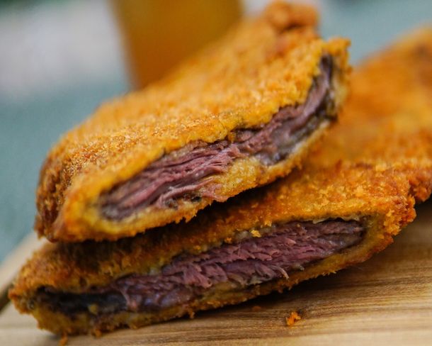 En Hierro sirven una milanesa de bife de chorizo lleva un rebozado especial a base de pan rallado, provoleta rallada y especias. Se fríe en abundante aceite y se termina a la parrilla con leña de quebracho colorado para darle un toque ahumado sutil.