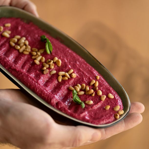 Hummus de remolacha y castañas de cajú