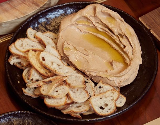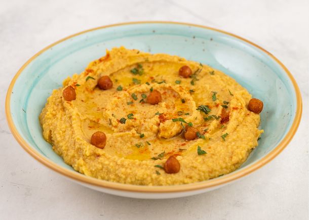 Un hummus dulce y untuoso elaborado con garbanzos y boniato asado, por el equipo de cocina de Behind Bar