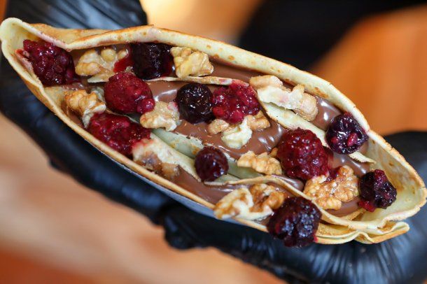 - Para el desayuno, merienda o postre, dentro de las crepas artesanales preparadas en el momento y servidas tibias, con abundantes rellenos salados y dulces que tientan a cualquiera, una de las favoritas es la Nutella, a la que se le pueden sumar dos ingredientes a elección entre almendras, nueces, trozos de banana, frutos rojos, confites de chocolate y galletas.