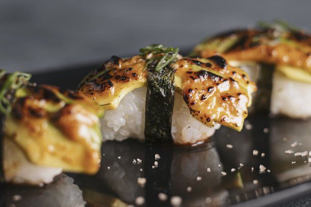 Luego pintar la superficie de la palta con salsa tailandesa. Para decorar, colocar aros de verdeo finos en el centro del nigiri.