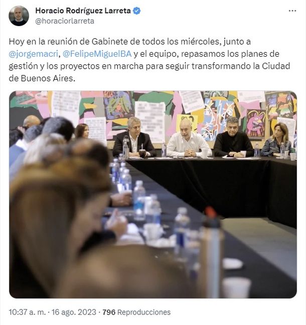 "Hoy en la reunión de Gabinete de todos los miércoles, junto a Jorge Macri, Felipe Miguel y el equipo, repasamos los planes de gestión y los proyectos en marcha para seguir transformando la Ciudad de Buenos Aires", expresó Larreta en las redes sobre el encuentro habitual del Gobierno porteño.