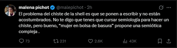 Finalmente, la escritora, comediante y activista feminista Malena Pichot también se sumó a las críticas, destacando el evidente error comunicacional detrás del video. Con su característico tono irónico, expresó :“El problema del chiste de la Shell es que se ponen a escribir y no están acostumbrados. No te digo que tenés que cursar semiología para hacer un chiste, pero bueno, ‘mujer en bolsa de basura’ propone una semiótica compleja”.