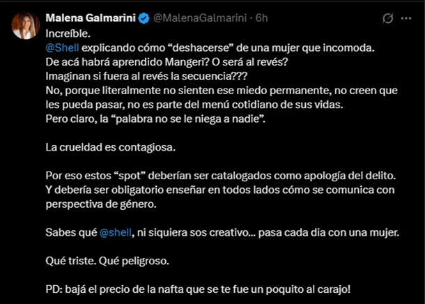 Además, pidió que contenidos de este tipo sean considerados como apología del delito y destacó la urgencia de incorporar la perspectiva de género en la comunicación en todos los ámbitos, cerrando su mensaje con una crítica a la empresa involucrada y una referencia irónica al precio del combustible.