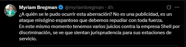 Por otro lado, Myriam Bregman, diputada nacional y activista feminista, calificó la publicidad como “una aberración” y “un ataque misógino espantoso que debemos repudiar con toda fuerza”. Asimismo, recordó que Shell enfrenta actualmente varios juicios por discriminación laboral, sugiriendo un patrón preocupante en las acciones de la empresa: “En este mismo momento tenemos varios juicios contra la empresa Shell por discriminación, se ve que sientan jurisprudencia para sus estaciones de servicio”.