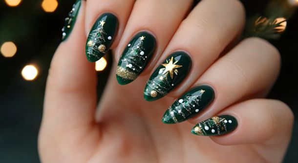 Otra tendencia en alza son los verdes profundos, como el esmeralda o el verde bosque, que remiten al árbol de Navidad y resultan elegantes y originales. Combinados con líneas finas en dorado o pequeños brillos, logran un diseño sofisticado sin exceso.