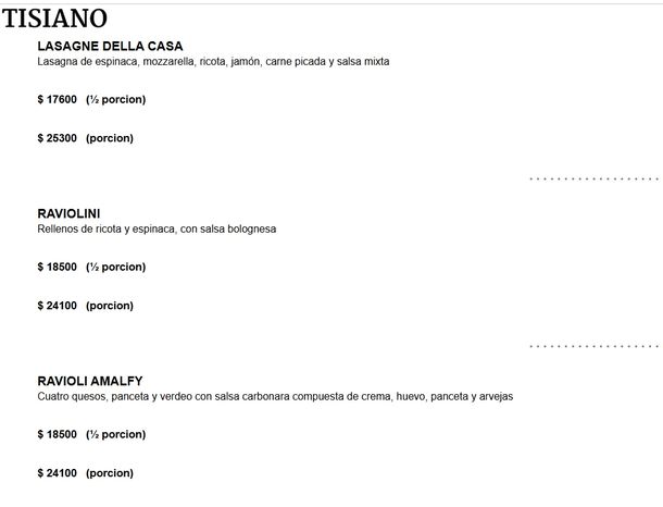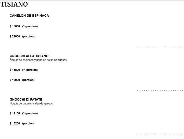Por ejemplo, una porción de canelones de espinaca cuestan 21 mil pesos y comen dos bien, la media porción que es suficiente para un comensal $15.600.