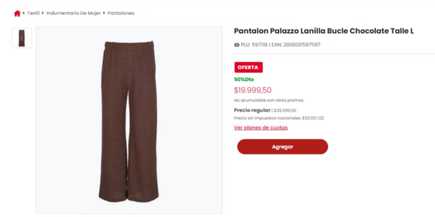 El modelo en oferta es el Palazzo lanilla bucle chocolate talle L, que ahora se consigue a $20.000. El descuento representa una rebaja del 50% sobre su valor original de $40.000 y está disponible exclusivamente en la tienda online de Coto.