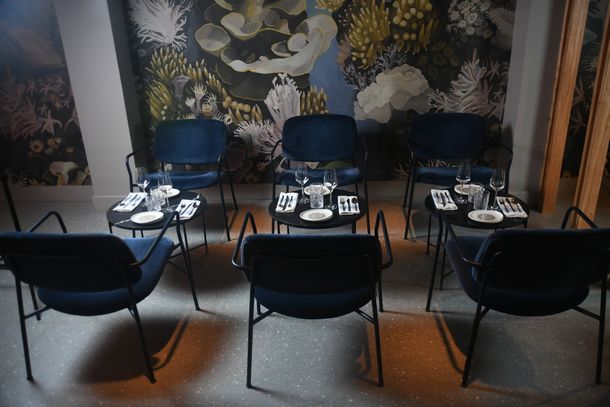 En el primer nivel, dedicado al agua, un salón central con mesas de madera y mármol, sillas en tonos cálidos y un mural de la artista Magui Trucco —inspirado en mares y ríos argentinos— crea un ambiente sereno y envolvente. El segundo piso funciona como un living relajado, con una barra de madera maciza, mesas bajas de mármol, sillas de terciopelo azul y ramas cordobesas suspendidas del techo, que refuerzan el espíritu natural del lugar. En el tercer nivel, el concepto Tierra se expresa con líneas sobrias y colores cálidos que evocan el campo argentino, incluyendo una cava vidriada y un espacio privado con gran mesa de madera, ideal para encuentros íntimos.