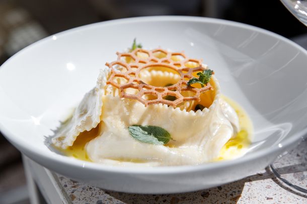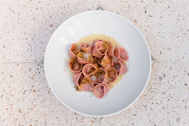 - Cappelletti de remolacha con provolone, pangrattato, manteca y lima.