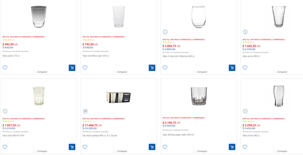 Carrefour ofrece una promoción distinta: la segunda unidad al 50%. Es una buena oportunidad para quienes compran de a pares o necesitan reponer varios vasos del mismo tipo. Algunos ejemplos: