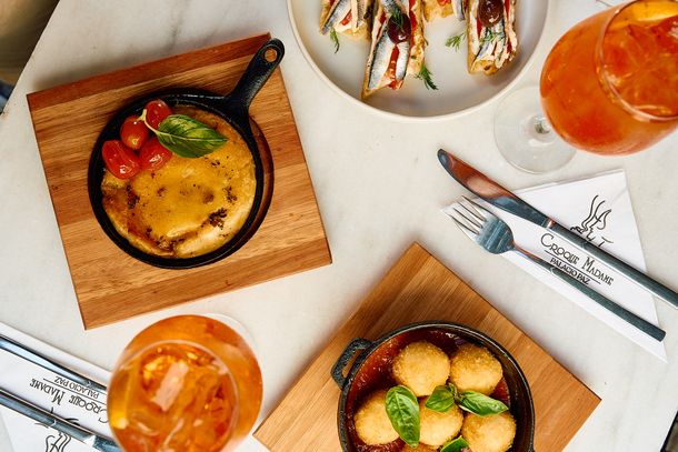 En el imponente entorno del Palacio Paz, Croque Madame invita a disfrutar de su menú nocturno, disponible todos los días de la semana a partir de las 20 h. La propuesta combina elegancia y sabor en un formato completo que incluye entrada, plato principal, bebida, una copa de vino Salentein (Malbec o Chardonnay) o un aperitivo Ramazzotti, y postre o café por $39 000 por persona. Entre las entradas, se puede elegir entre los buñuelos de espinaca y acelga con alioli de albahaca o la empanada de osobuco acompañada de salsa yasgua y gajo de limón. Los principales ofrecen una atractiva variedad de posibilidades: bondiola teriyaki con puré de batata y miel, spaghetti con pesto genovese, ravioles de ternera con crema cacio e pepe o risotto de hongos. Para el final, un toque dulce con tiramisú casero o una bocha de helado de crema americana o chocolate, o una taza de café Nespresso.