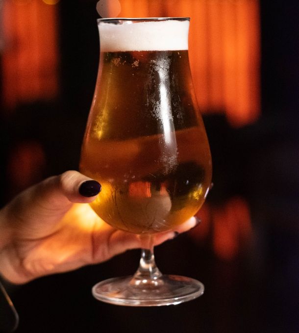 Su estética apuesta por la calidez de la madera en tonos oscuros, luces ámbar y detalles industriales que crean una atmósfera íntima y sofisticada. En el exterior, una terraza con mesas de madera y cuero resulta ideal para veladas al aire libre. Tanto desde el interior como desde la calle, una pared vidriada deja ver los tanques de acero inoxidable donde se almacena la cerveza artesanal que se sirve directamente a la copa.