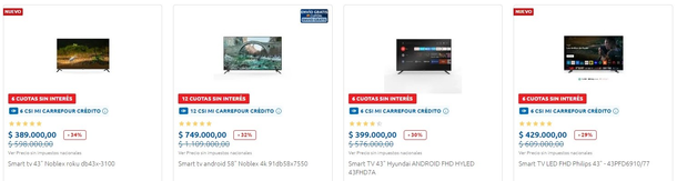 En el rubro televisores, la cadena ofrece Smart TV con descuentos de hasta el 30% y planes de hasta 12 cuotas sin interés, especialmente para quienes utilizan la tarjeta Mi Carrefour, que cuenta con beneficios exclusivos.