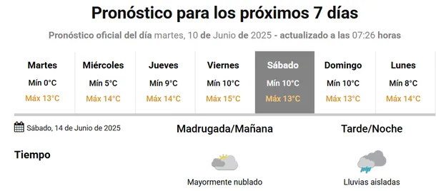 El sábado 14 de junio las condiciones meteorológicas serán similares a las de viernes, con el día mayormente nublado, con alguna posibilidad -todavía baja- de chaparrones dispersos durante la noche.