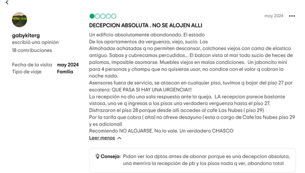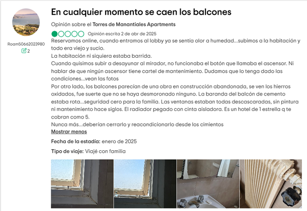 En la mayoría de los sitios y apps vinculados al alquiler y reservas para hoteles y lugares de descanso hay chances de dejar opiniones y algunas de ellas son muy duras con Torres de Manantiales, inclusive con fotos para argumentar lo expuesto en los comentarios.