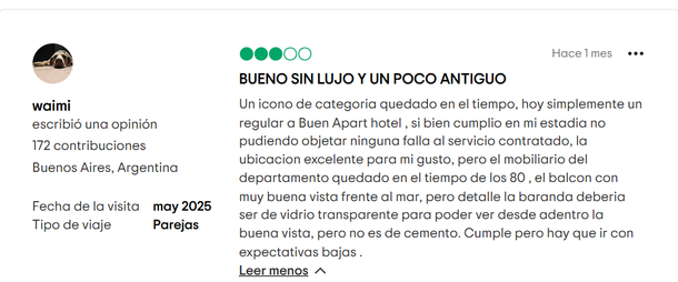 Hasta en comentarios menos duros, la opinión es tajante sobre el mobiliario y la falta de mantenimiento, como la de este pasajero que se alojó en mayo de 2025: