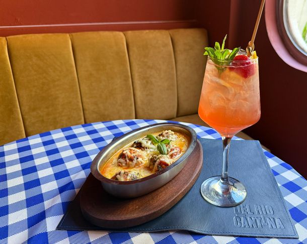 Del Río Cantina envuelve en una atmósfera única. Su diseño en dos niveles, cada uno con su propio encanto, permite disfrutar de diferentes experiencias. La planta baja, íntima y serena, es perfecta para encuentros tranquilos, mientras que el primer piso, bañado por la luz natural de un gran ventanal y con un pequeño balcón, es ideal para grupos y celebraciones. La decoración, con mesas de madera, sillas cómodas y manteles a cuadros, evoca la nostalgia de las cantinas de antaño, creando un ambiente familiar y lleno de historia.