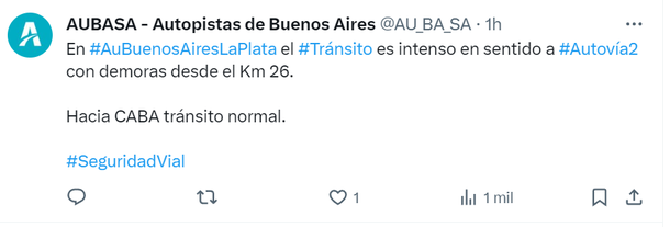 Los problemas, según informa Aubasa, comienza en la autopista Buenos Aires- La Plata para llegar a la ruta 2, donde el tránsito por momentos está colapsado